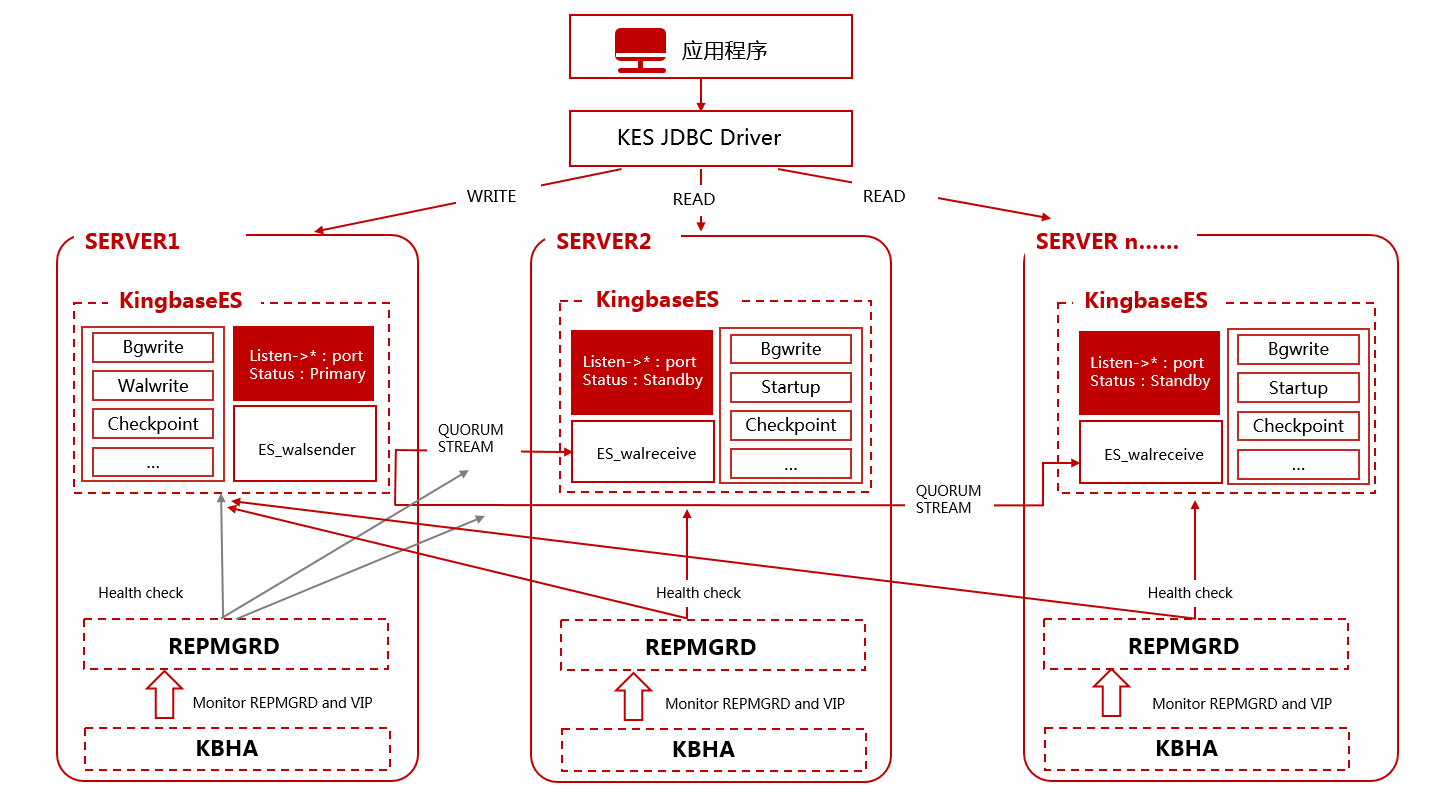 KingbaseES 读写分离集群(KingbaseRWC): KingbaseES 读写分离集群通过物理复制保障企业数据的高可用性、数据保护和灾难恢复并具备读请求的负载均衡能力。相比数据守护集群,该类集群中所有备库均可对外提供查询能力,从而减轻了主库的读负载压力,可实现更高的事务吞吐率;该软件支持在多个备库间进行读负载均衡。
