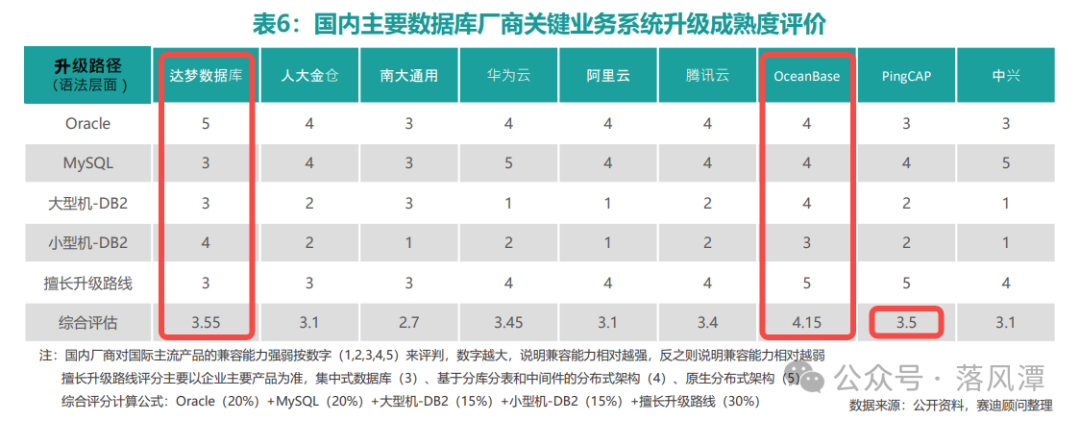 OceanBase在兼容性和升级路线上综合得分最高;达梦排名第二,对Oracle兼容性最好。