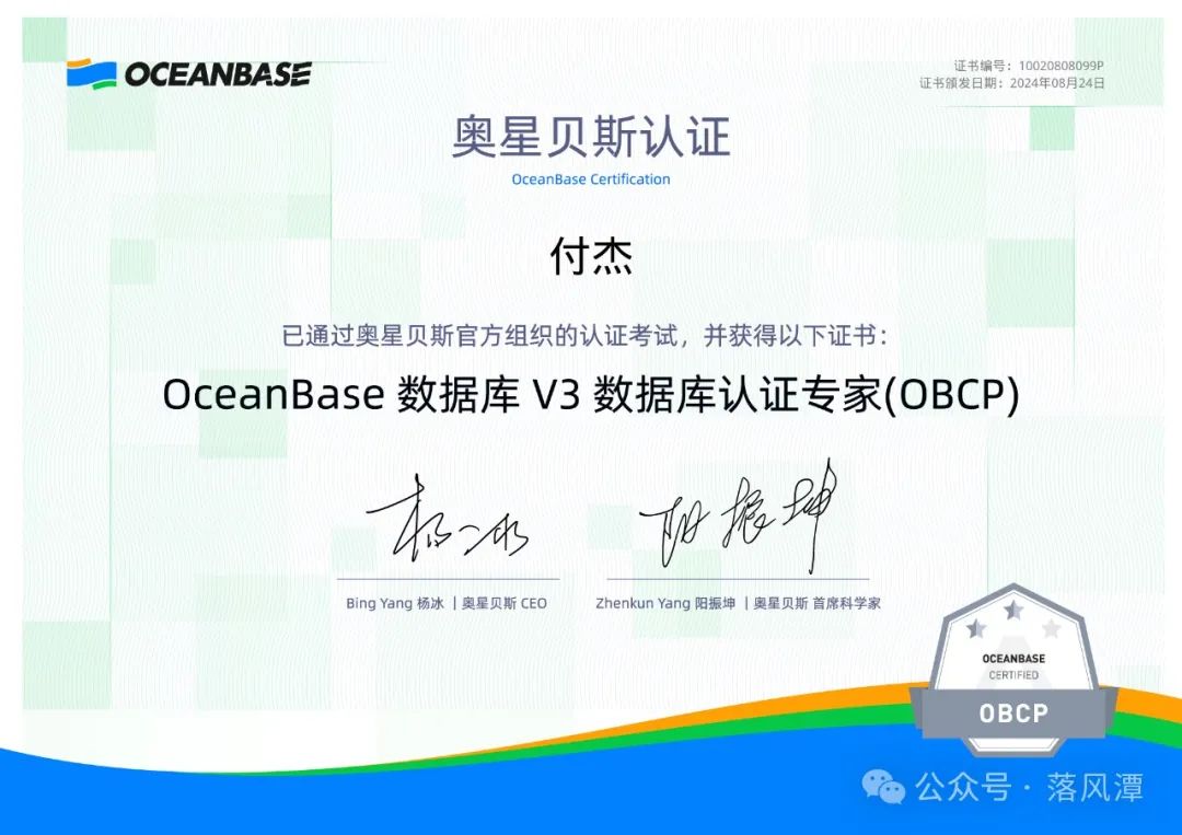 拖了大半年,潭主终于在上周末拿到了OceanBase的OBCP证书,了却了一桩心事。