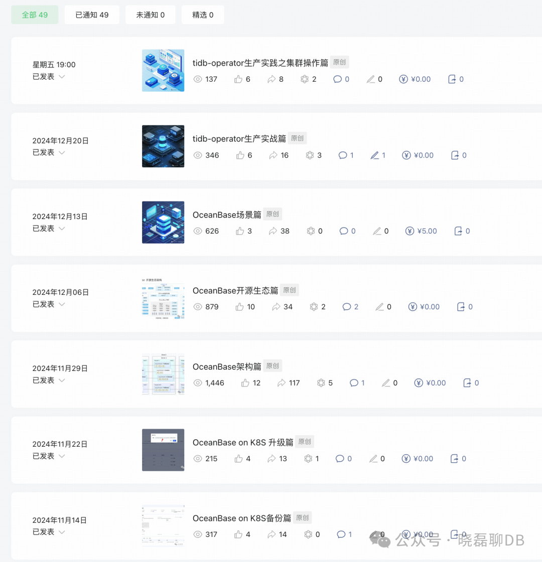 2024年从7月份工作忙的差不多之后,利用周末以及空闲时间把自己已经“忘记密码”的公众号文章写作给捡了回来,说是捡回来,其实今年刚开始的几篇文章都是自己历史分享过的PPT,直接上传,后来逐渐形成周更模式,并且开始更新OceanBase系列(后面会更新TiDB系列),因为在使用OB的过程中遇到了各种问题,有时看文档或者跟OB技术支持交流获得了一些文档上没有的解决方案,这些问题其他人大概率也会遇到,这时将问题整理分享出来,下一个遇到同样问题的人就不用再次询问社区或者各种查文档了。这也是社区文章对数据库产品本身以及社区成员带来的好处。