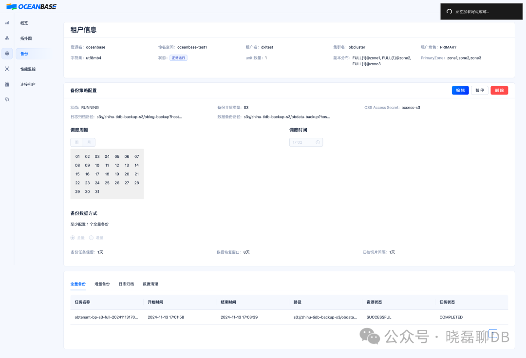 通过OceanBase DashBoard中租户的备份业务发现已经完成了一次全量备份。至此完成了OceanBase on K8S在百度云对象存储S3介质的数据备份。
