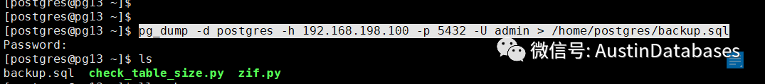 (pg_dump -d postgres -h 192.168.198.100 -p 5432 -U admin > /home/postgres/backup.sql)