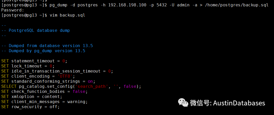 pg_dump -d postgres -h 192.168.198.100 -p 5432 -U admin > /home/postgres/backup.sql