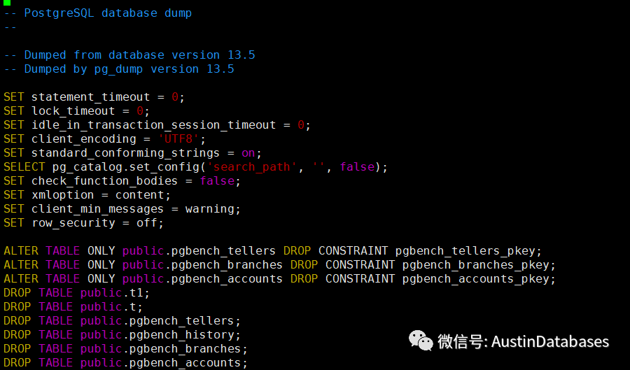 导出 postgres 数据库表结构以及其他OBJECT 和数据,到指定的 /home/postgres/backup.sql 文件中,其中数据使用copy方式呈现在导出文件中