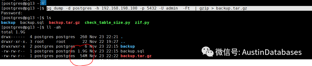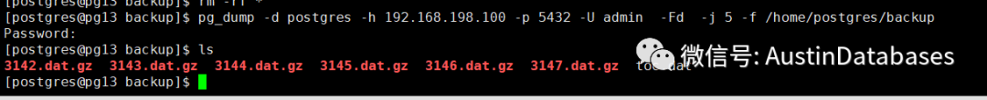 对应的数据导出方式(pg_dump -d postgres -h 192.168.198.100 -p 5432 -U admin -Fd -j 5 -f /home/postgres/backup)