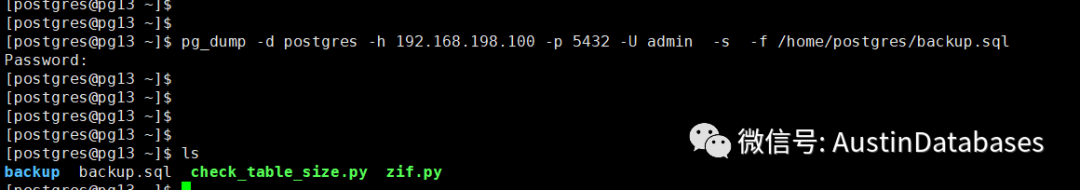 pg_dump -d postgres -h 192.168.198.100 -p 5432 -U admin -s -f /home/postgres/backup.sql