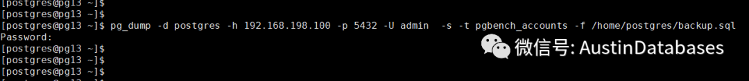pg_dump -d postgres -h 192.168.198.100 -p 5432 -U admin -s -t pgbench_accounts -f /home/postgres/backup.sql