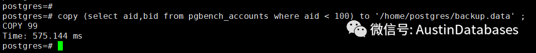 copy (select aid,bid from pgbench_accounts where aid < 100) to '/home/postgres/backup.data' ;