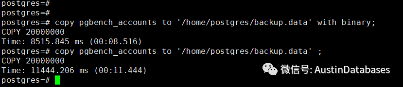 copy pgbench_accounts to '/home/postgres/backup.data' with binary;