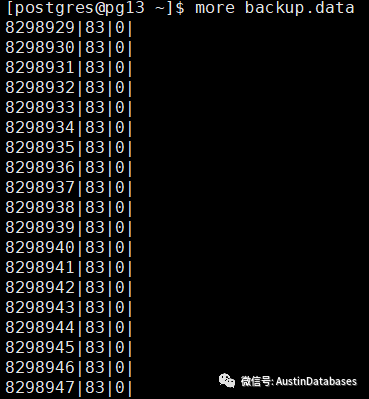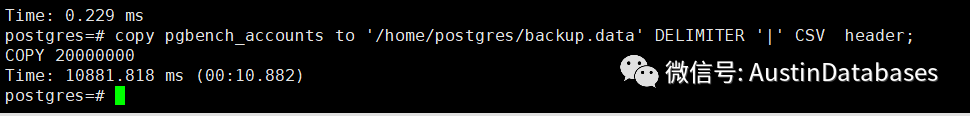 copy pgbench_accounts to '/home/postgres/backup.data' DELIMITER '|';