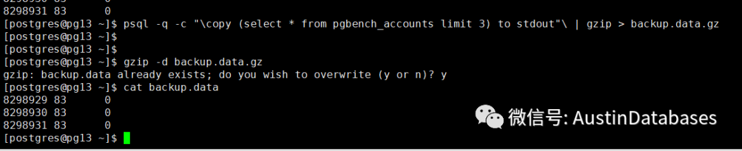 psql -q -c "\copy (select * from pgbench_accounts limit 3) to stdout"\ | gzip > backup.data.gz