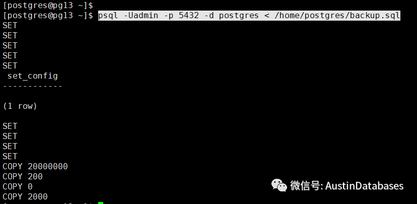 psql -Uadmin -p 5432 -d postgres < /home/postgres/backup.sql