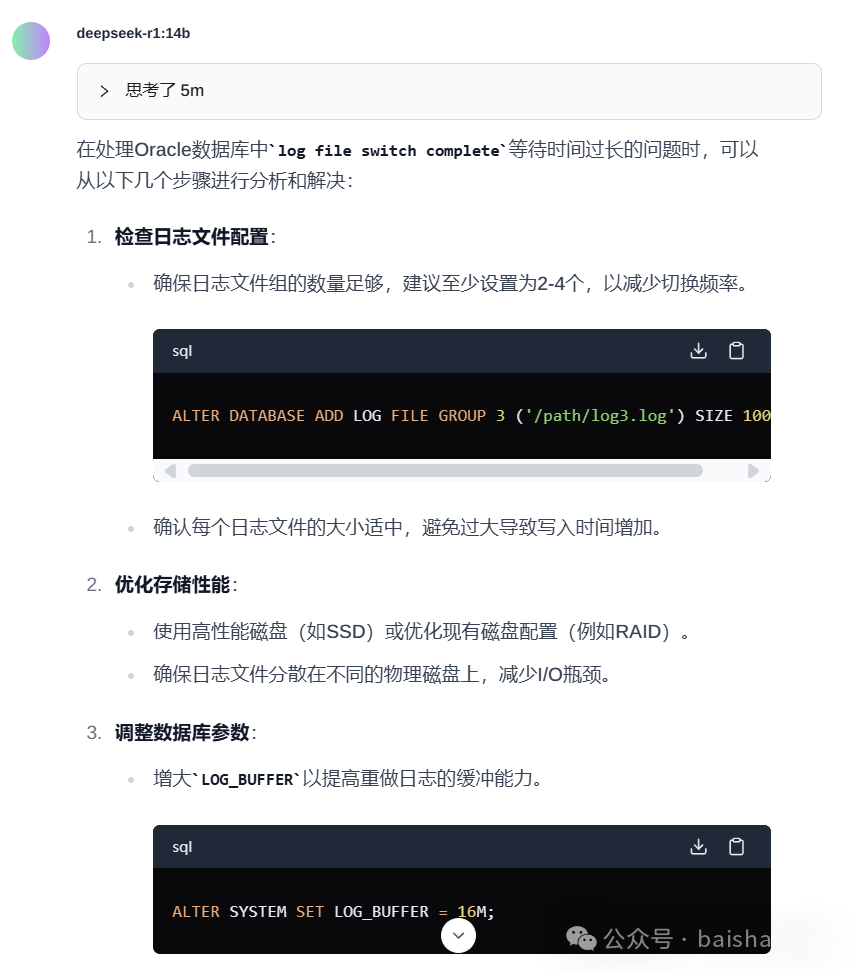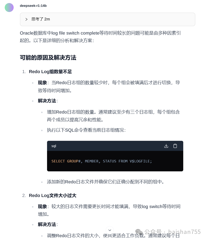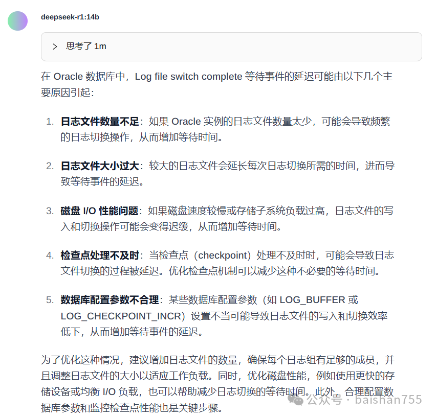通过这个简单的实验,让我思考了许久。首先基于deepseek-r1去实现更加强大的分析推理,是完全可行的。其次是AIGC并不是万能的,并不是部署了一套deepseek,就可以解决AIOPS的主要问题了,高质量的运维经验依然是实习那AIOPS的关键,在这方面还是需要投入巨大的资源才行。高质量的数据库领域大模型依然是AIOPS 实现中成本最高的,不知道哪个大厂能够率先做出一个并开放给公众免费使用。