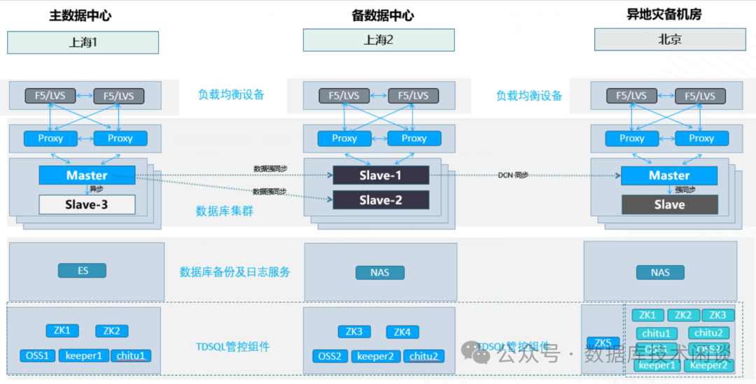 在生产环境里,还要考虑多机房容灾部署。下面是常用的两地三中心部署架构图。