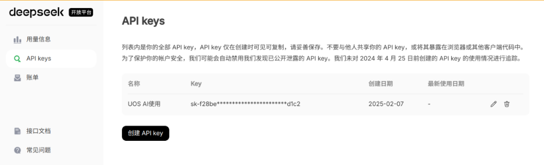 访问 DeepSeek 官网,注册/登录账号后,创建并获取 API Key。若由于服务器压力等问题无法访问以上页面,也可以使用其他访问渠道获取 API Key。