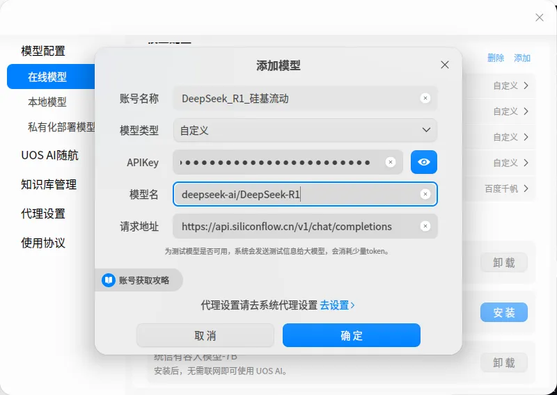 方法二:使用 UOS AI 的自定义模型接口在线接入 DeepSeek-R1 API