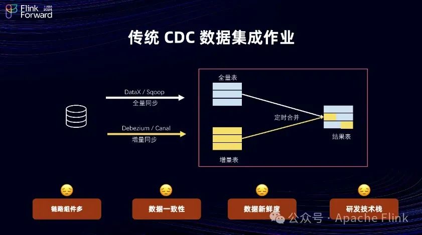 在讨论 Flink CDC 的优势之前,我们先回顾一下传统 CDC(变更数据捕获)的数据集成方案。尽管这种架构较为传统,但目前仍被众多企业所采用。这类做法是将全量数据同步和增量数据同步分开处理:全量同步基于 DataX 或 Sqoop 完成,而增量同步则使用 Debezium 或 Canal 等组件来实现。系统中会同时存在两张表——一个用于存储全量数据,另一个用于存放增量更新的信息;两表由调度系统定时进行合并,方可得到完整的结果表。这种方法的缺点在于整个流程较长且涉及多个组件,这不仅增加了系统的复杂性,也对维护提出了更高的要求。此外,由于定时任务无法保证事务级别的数据一致性,因此难以确保每次合并后的数据都是符合数据库一致性语义的。此外,上述链路难以满足对高时效性场景的需求。即使是极限配置下的调度策略,其更新频率也很难低于5分钟一次;若试图进一步缩短时间间隔至秒级,则很可能导致链路负荷过高,进而崩溃。1.4 基于 Flink CDC 的数据集成作业