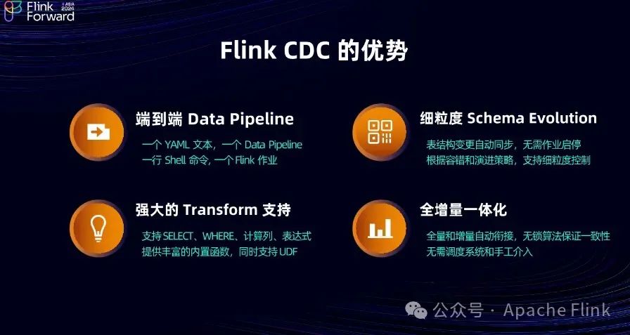 Flink CDC 的架构优势在于其提供了一个端到端的数据流水线(Data Pipeline)。用户仅需编写一个 YAML 文件来定义整个数据流水线的处理逻辑,同时,它还配备了工具支持,使得现有的命令可以直接将 YAML 描述的数据流水线转换为 Flink 作业运行起来。这大大简化了配置和启动流程。在过去的一年里,社区在“细粒度 Schema Evolution”(表结构变更同步)方面做了大量工作。这项功能允许更灵活地应对数据库模式变化的情况,包括但不限于容错机制、容错级别以及进化策略的支持等。这些改进使得 Flink CDC 能够更好地适应不同业务场景下的具体需求。此外,ETL(抽取-转换-加载)过程中的“转换”(Transform)环节对于数据集成至关重要。Flink CDC 在此环节提供了强大的类 SQL 表达能力,支持对部分列进行投影、根据表达式追加计算列、按条件过滤数据行等功能,并且支持表达式嵌套及用户自定义函数(UDF)等。这样的设计极大地提升了基于 Flink CDC 的数据集成任务的效率与灵活性。值得注意的是,Flink CDC 作为早期就致力于实现全增量一体化解决方案的技术之一,不仅能够处理实时变化的数据捕获问题,同时也兼顾了历史数据的批量导入,从而为企业级应用提供了更加全面的数据同步方案。2.1 Flink CDC 发展历史