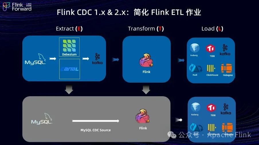 Flink CDC 2.x 系列版本实现了社区原创的“增量快照算法”,能够并行执行数据表快照,并实现全增量阶段的无锁切换,得到了阿里及其他云厂商公司在生产上大规模的验证及使用。增量快照算法的核心思路是将每张表按照主键列进行分块(Chunk)后由多个节点进行分布式读取,并通过水位线填充算法保证数据一致性,既不锁表也能提供精确一次语义。此外,此版本还增加了对 Db2、MongoDB、OceanBase 等数据库的支持。2.4 Flink CDC 1.x & 2.x:简化 Flink ETL 作业