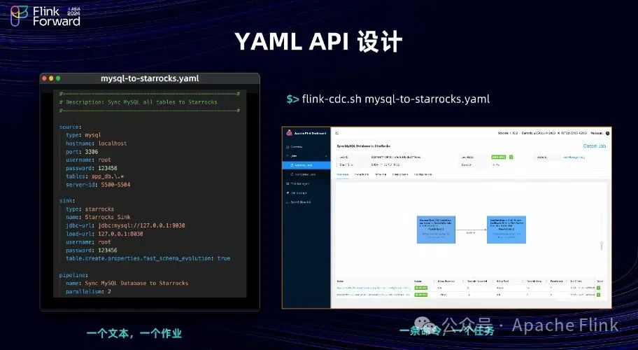 在上述背景下,我们在社区推出了 Flink CDC 3.x 版本,提供了一个面向端到端的实时数据集成框架。它提供完整的数据集成体验,不仅提供了 Source 连接器,还提供了写入外部系统的 Sink 连接器。它能够识别源表的表结构变更,并通过特殊的事件报告给下游;能够正确处理上游动态加表、删除表等事件;此外,很重要的一点是版权归属问题。早期版本的 Flink CDC 在阿里巴巴组织下开源,可能导致社区中立性的疑虑。这些疑虑在捐赠给 Apache 基金会后得到了解决。2.6 YAML API 设计