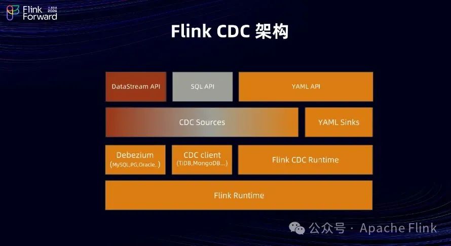 在设计 YAML API 时,我们主要从两个方面进行了考量:一是面向的目标用户,一是 API 的设计原则。用户的需求是很简单的,MySQL 的数据要写到湖里、写到仓里。目标用户当然不需要是 Flink 的专家,这些初级用户正是 YAML API 的潜在用户。API 的设计原则是:足够简单,足够强大。这些是设计 YAML API 的时候个人的考量。最终推出的 API 也经过了很多方案的比较和选择,当时社区的设计稿讨论到了第五版,大家也对业界的数据集成框架、以及它们采用的 DSL 语言做了很多调研,最终选择基于 YAML。YAML 被广泛接受的原因之一是它的使用门槛比较低,可以理解它是若干个具有层级关系的 KV Pair 组成的文本文件,能够清晰地描述数据集成的逻辑,通过文本就能描述复杂的数据集成的 Flink 作业。为了进一步简化体验,社区还提供了一个 CLI 命令行工具,可以让用户编写一个 YAML 文本,执行一条 shell 命令,就能生成一个 Flink CDC 作业。2.7 Flink CDC 架构
