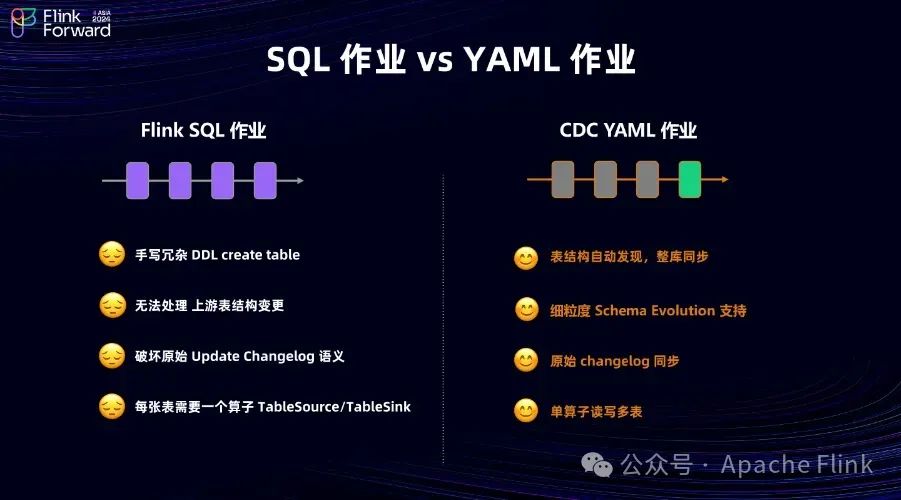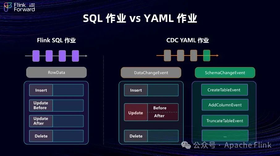 在加入 YAML API 后,Flink CDC 整体的架构如图所示。大家发现我特地标了不同的颜色,方便对三种 API 做详细的对比,包括 DataStream API,SQL API 还有 YAML API。DataStream 和 SQL API 下层都只有 CDC 的 Source,而 YAML API 下层不仅有 Source,还有 Sink ,这是最大的不同。此外,在 YAML API 下面还有一层 CDC Runtime,这其中包含一些运行时的算子逻辑。比如为了实现 Schema Evolution、要提供 Table Route 和 Transform 等特性的支持,就需要在运行时插入一些额外的流处理算子;而 DataStream API 和 SQL API 都不能提供这样的能力。2.8 SQL 作业 vs YAML 作业