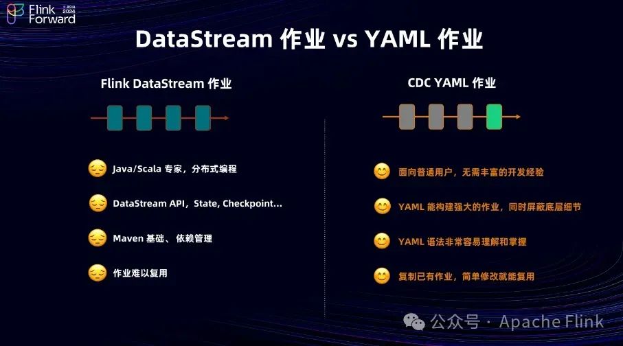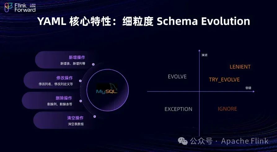对比一下 DataStream 作业和 YAML 作业,如果一个 Flink DataStream作业,需要用 CDC JSON Format 描述数据结构。这意味着每一条数据记录中,都需要携带对应 Schema 的信息描述。考虑到表结构变更并不常见,大部分数据记录的 Schema 都一样,重复发送给下游的 Schema 就会造成信息冗余、存储空间和 IO 带宽的浪费。而在 YAML CDC 中,数据记录中所有的结构都是经过压缩的 Binary Data,相比 DataStream 的数据记录结构更紧凑,在底层的物理存储上更加节约内存。此外,YAML 作业只在 Schema 发生变化时发送 SchemaChangeEvent 来描述变更信息,即总是使用最新的的 Schema 来描述随后的所有 DataChangeEvent,直到新的 SchemaChangeEvent 出现。这样的设计不用给每条数据记录携带一份 Schema 数据,减少了信息冗余。总结一下 DataStream API 和 YAML API 的区别。DataStream API 主要面向熟悉 Java、Scala 的开发者,且需要对分布式系统有一定理解,才能写出正确且高效的 Flink 作业(包括 Flink 的 DataStream API,持久化 State Backend、Checkpoint 模型等)。此外,为了将 Jar 作业提交到 Flink 上正确执行,还需要了解 Maven 及依赖管理相关的知识。最后,Java 作业其实是比较难以复用的;一个描述 MySQL 写入 Paimon 的 Jar 作业,想要迁移写入 Kafka,很多部分可能都需要从头重写。而 YAML API 就可以比较轻易地应对这些问题。它面向普通用户,不要求高深的前置知识,即可构建强大的整库同步、表结构同步作业。此外,YAML 语法很简单,业界也比较通用,想要复用已有作业就更简单了,因为它只不过是一段文本,只需要对 Source、Sink 的部分属性稍加修改,就能实现写入目标的迁移。2.10 YAML 核心特性:Schema Evolution下面介绍 YAML 的核心特性,第一个是上下游同步的表结构变更(Schema Evolution)。核心原理是在 YAML Pipeline 中传递的事件类型是 Event,既包括描述数据记录变更的 DataChangeEvent,也包括描述表结构变更的 SchemaChangeEvent。在遇到表结构变更事件时,将 Pipeline 里现存的数据全部落盘,然后根据 SchemaChangeEvent 进行表结构的演化,成功后即可继续处理上游数据。目前,上游 MySQL 数据库中可能发生很多 DDL 变化,例如新增表、新增列,修改列类型、重命名列、删表删列等,但在实际业务中,不同类型的结构变更可能有不同的处理需求。例如上游某一列被删除了,下游可能希望保留;部分上游支持的表结构变更,下游可能无法实现。又或者是用户不希望下游表的结构发生改变,不用动业务代码。这样的诉求可以通过 Schema Change Behavior 选项和细粒度配置实现。目前社区推荐使用 LENIENT 和 TRY_EVOLVE 两种模式。LENIENT 是最宽容的模式,能够保证 Schema 的向前兼容性,下游业务方的业务代码不用动。TRY_EVOLVE 会尽量将上游表的变更应用到下游,但相比 EVOLVE 模式略微宽容些,会做一定程度的容错。其他两种模式就比较简单了。EXCEPTION 模式碰到 SchemaChange 就直接抛异常,IGNORE 模式则是忽略所有表结构变更,保证下游 Schema 始终不变。3.1 YAML 核心特性:Transform 设计