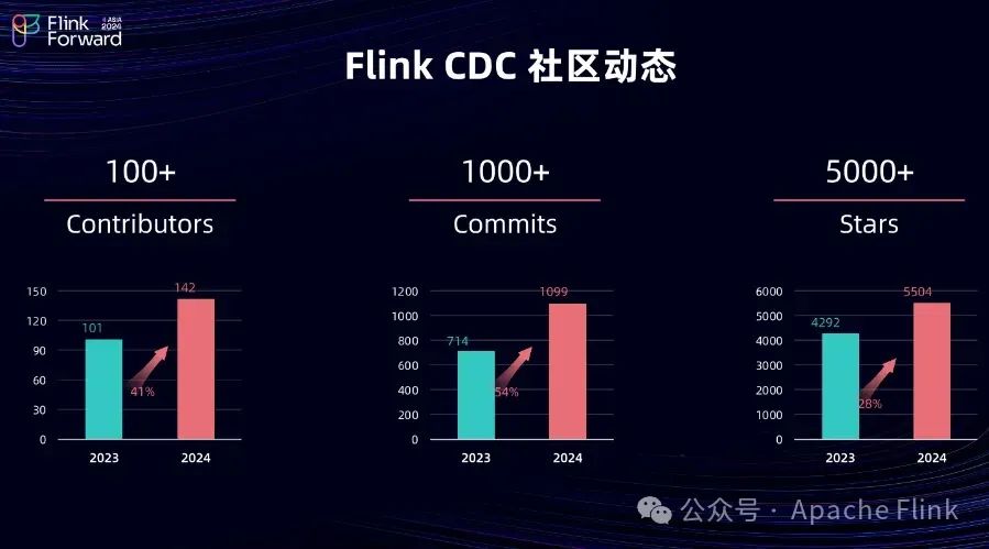 上图是 Flink CDC 社区在 2023 年和 2024 年的数据对比(截止到十月制作 PPT 之时)。社区贡献者从 101 位增加到 140 几位,增长 40% 多。主分支上的代码 commit 数量随着最近一年在 Scheme Evolution、YAML、AI Model 的集成等功能的实现,Commits 数量大幅增加 50%。社区的 Stars 现在大概有 5000+。4.2 Flink CDC 社区规划