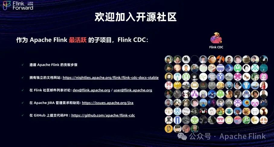 社区规划方面主要分为两部分。第一部分,我们希望解锁更多新的场景,例如 AI Model 的深度集成(笔者注:春节前发布的 Flink CDC 3.3.0 版本已经支持该特性),支持 Batch Pipeline、流批一体等;对接更多的上下游,例如支持 Apache Iceberg,之后会由货拉拉和天翼云的老师一起推动。此外还有支持更多 Schema Change 类型,例如 MySQL 的 Schema 类型总共大概有三十几种,目前应该只支持十几种,许多罕见的类型也希望能够完整支持,保证在线上极端的 Schema 变更的 Case 都能覆盖到。另一部分是关于稳定性的打磨,包括数据限流,细粒度的异常工程。这里的稳定性指的不是 Flink 框架不稳定或者 CDC 框架不稳定,主要是因为 Pipeline 作业和上下游息息相关,上游 DB 负载高, CPU 高或者下游的 Kafka 写的时候压力太大都会导致 Pipeline 不稳定,但是它的根因并不一定在框架,但框架提供的容错支持能够极大地改善用户体验。围绕这部分的工作包括数据限流、兼容更多的 Flink 版本,依赖库版本升级等等。4.3 欢迎加入开源社区