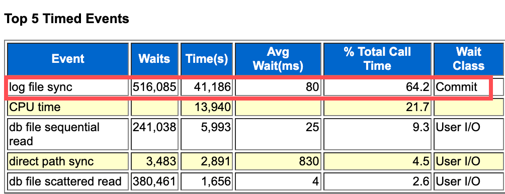 通过AWR分析看出来,log file sync占比64.2%,属于提交类异常等待