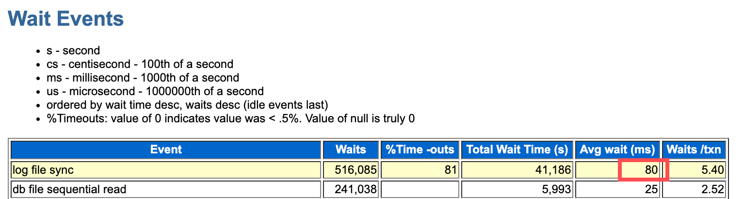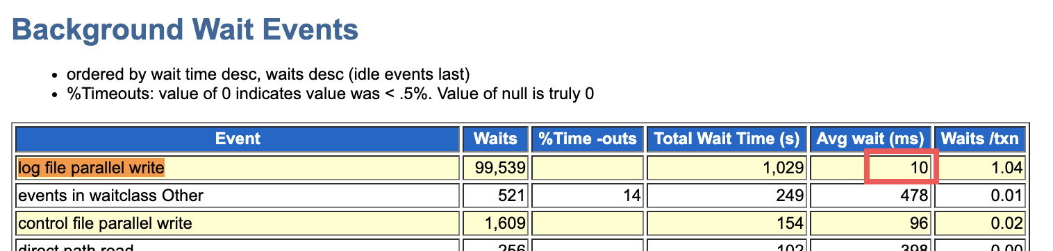 根据经验,“日志文件并行写入”的平均时间超过5-10毫秒,甚至可能更低,这表明IO子系统存在问题。