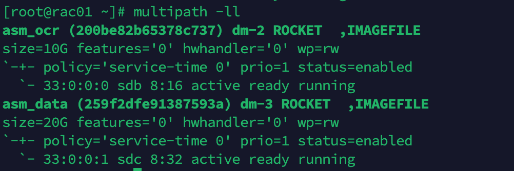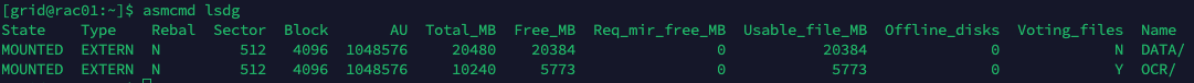 Oracle RAC 使用 ASM 存储来存放数据,通常使用 OCR 和 DATA 两个磁盘组!