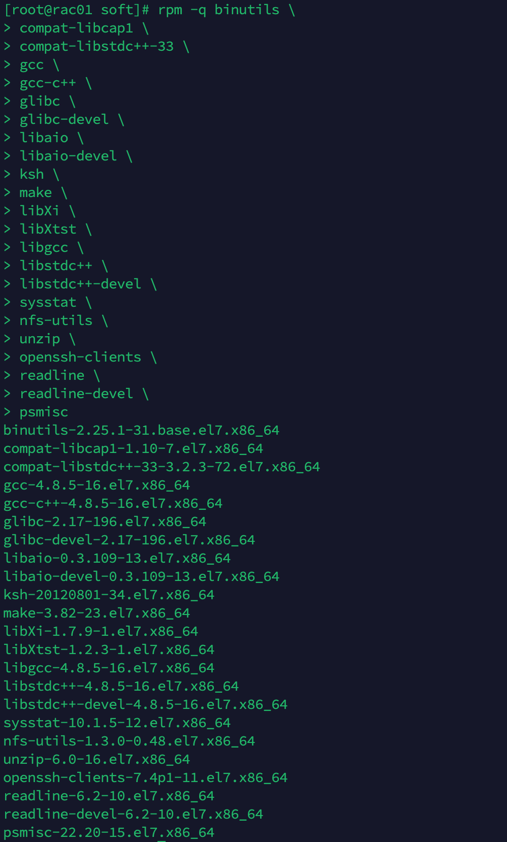 yum install -y binutils \ compat-libcap1 \ compat-libstdc++-33 \ gcc \ gcc-c++ \ glibc \ glibc-devel \ libaio \ libaio-devel \ ksh \ make \ libXi \ libXtst \ libgcc \ libstdc++ \ libstdc++-devel \ sysstat \ nfs-utils \ unzip \ openssh-clients \ readline \ readline-devel \ psmisc --skip-broken