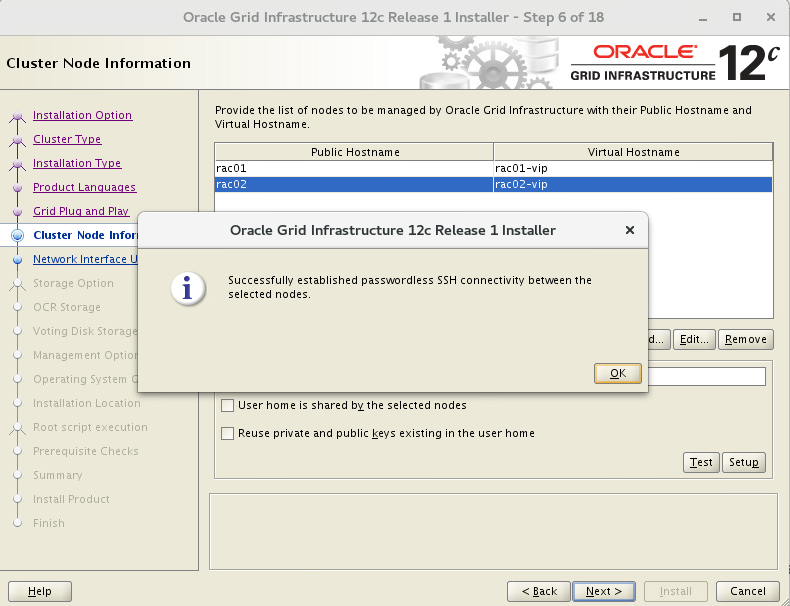 修改 scan 名称,与 hosts 文件配置 scan 名称保持一致,输入 grid 用户密码,创建用户时两节点必须保持一致。先执行 setup,再执行 test,开始互信: