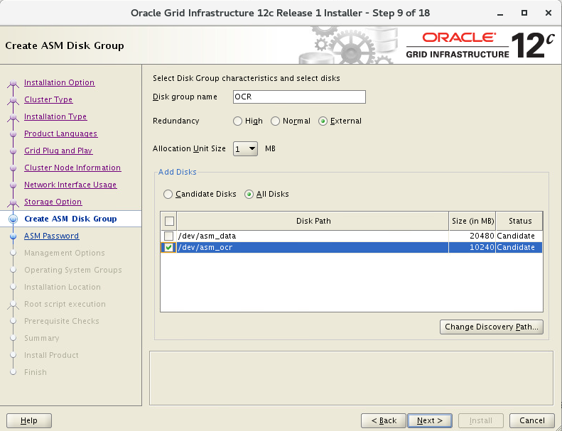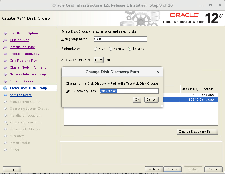 安装时填创建 OCR 盘,一块盘冗余 External,目录选择udev绑的路径: