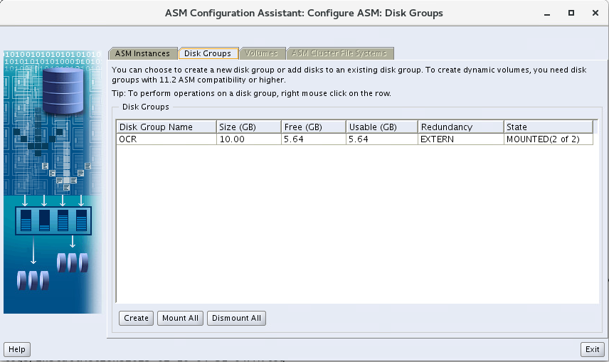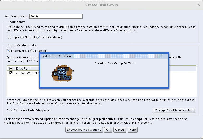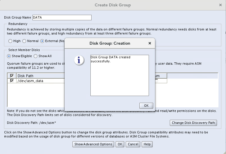 这里创建的 DATA 磁盘组主要用于存放数据文件、归档日志文件等数据库文件!
