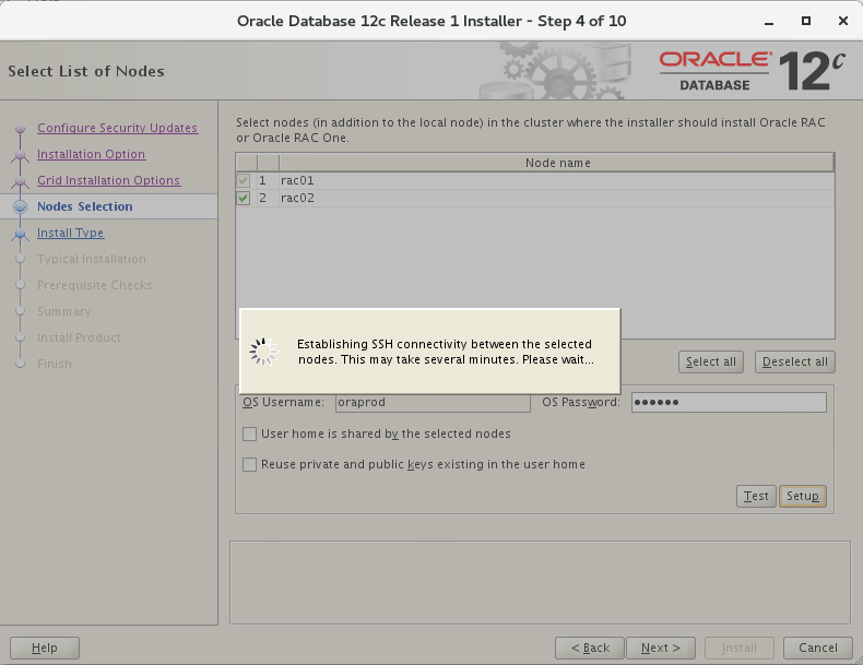 输入 oraprod 用户密码,先执行 setup,再执行 test,开始互信: