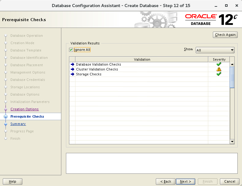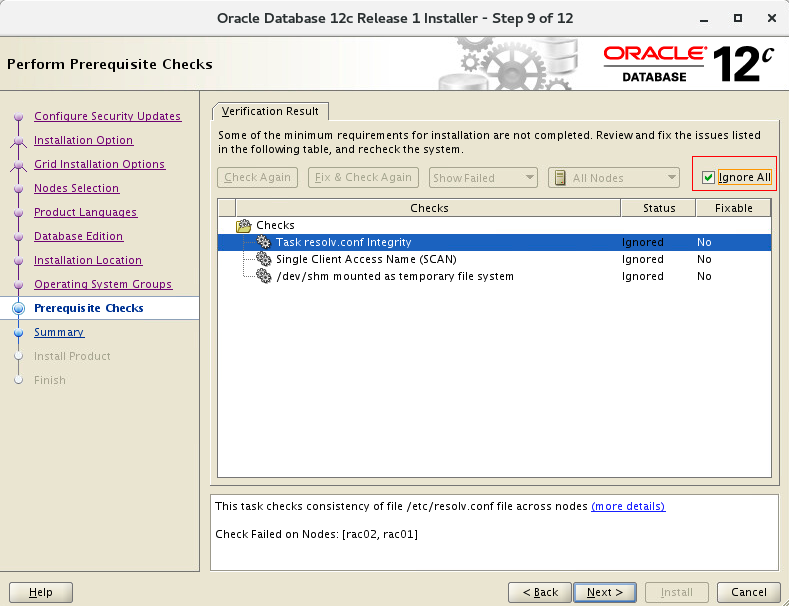 安装预检查,由于我们只配了一个 SCAN,所以关于 DNS 相关的都无视,继续: