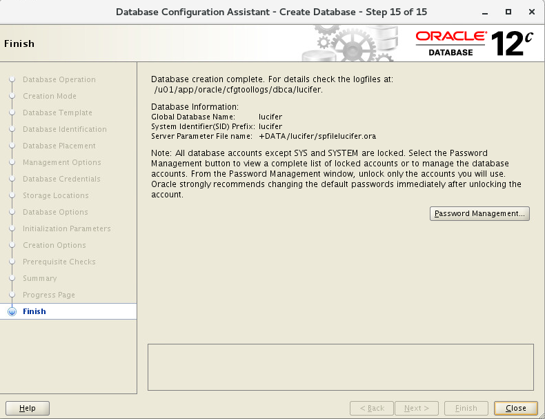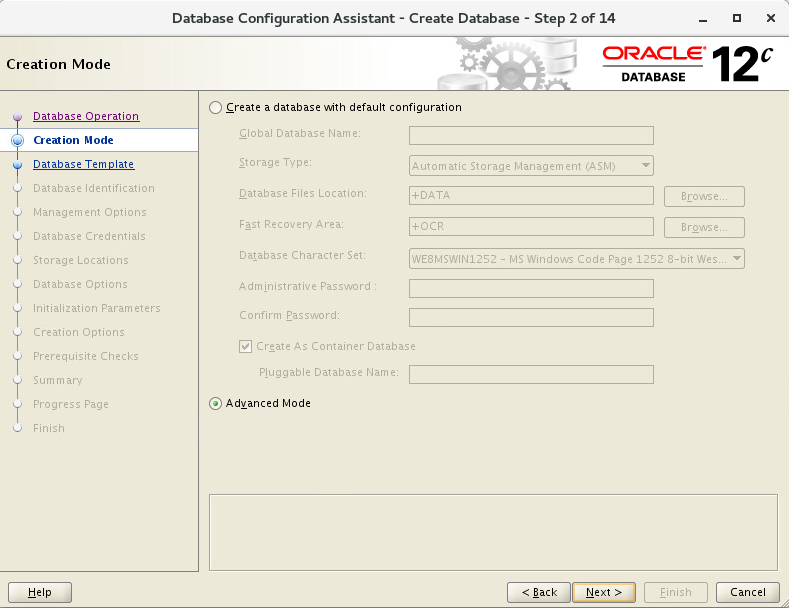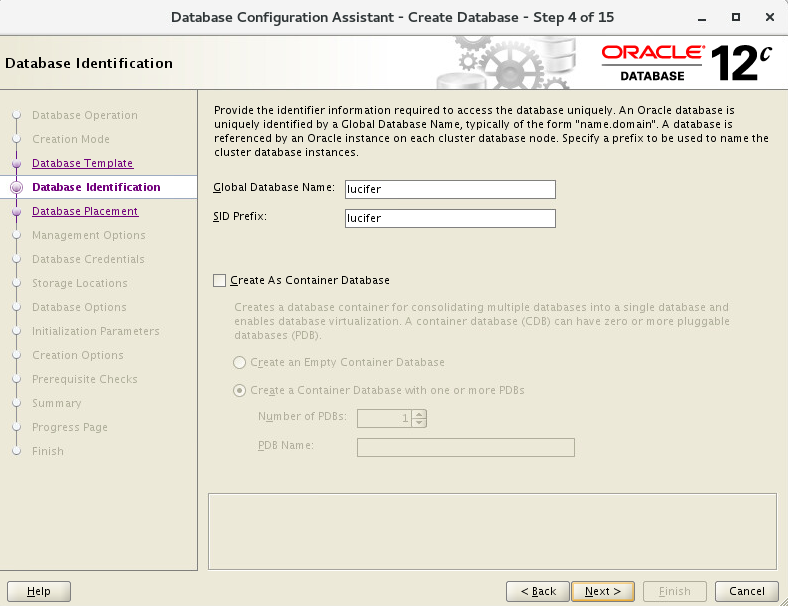 填写数据库名称 lucifer,由于默认添加为 1,2,实例名规划为 lucifer1/2;选择安装 CDB 模式,不创建 PDB: