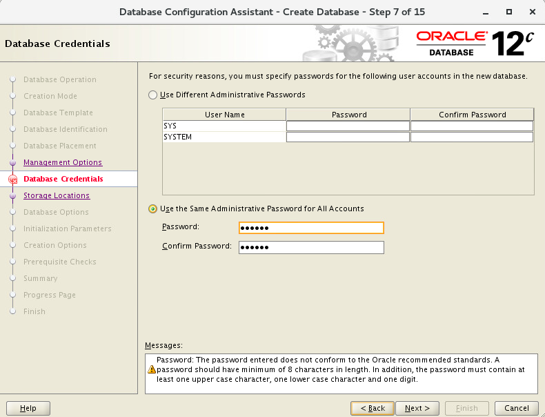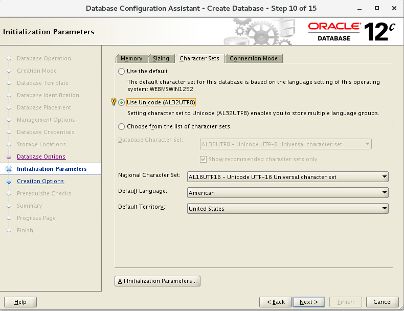 配置数据库字符集:默认 AL32UTF8,国家字符集:默认 AL16UTF16;根据实际业务情况修改成对应字符集: