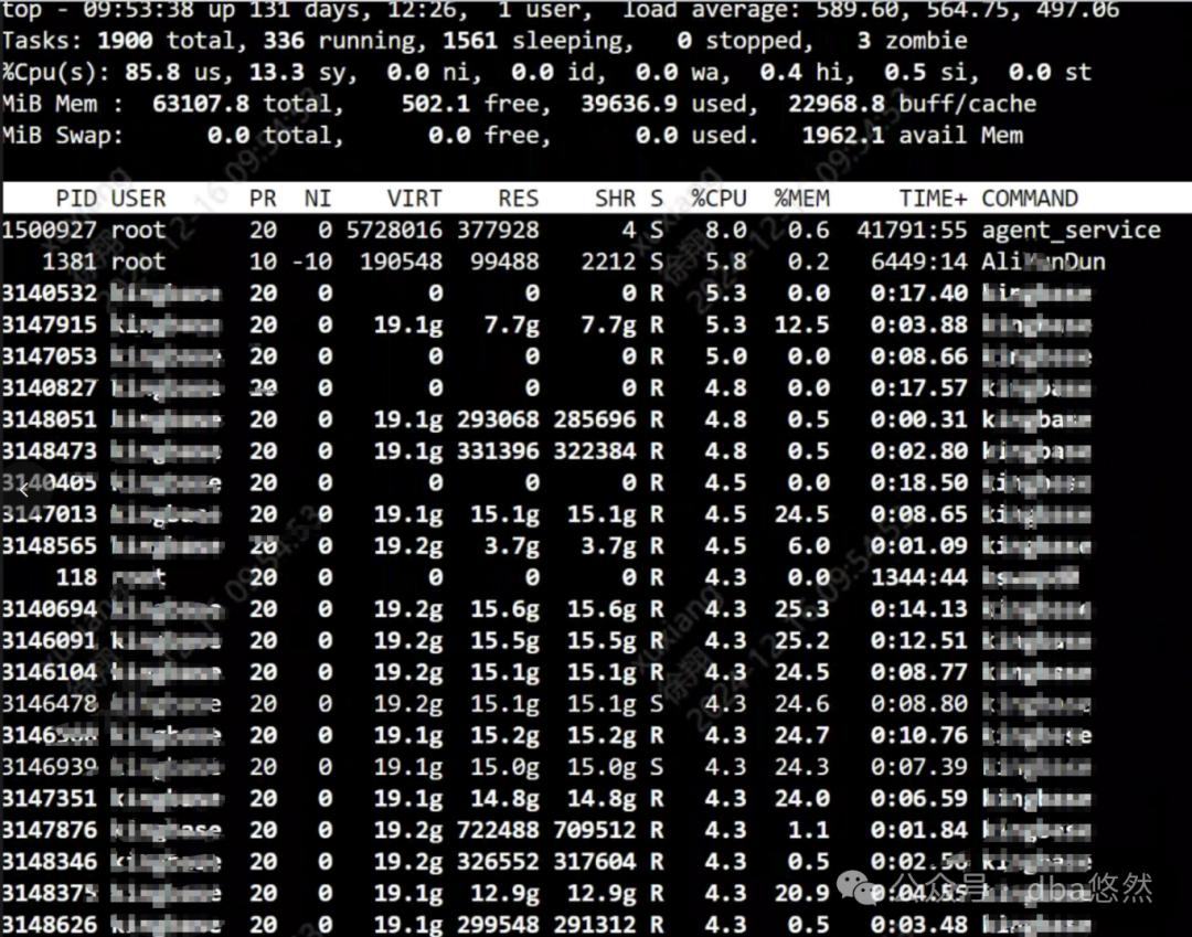 通过TOP进程跟踪,OS中部分TOP进程(cpu/mem)进程一直处于运行状态,而数据库中已无相关会话(截图未保存),是为僵尸进程;僵尸进程较多(700个多长dile进程),可以看到有内存泄漏,资源无法回收(操作系统hang)