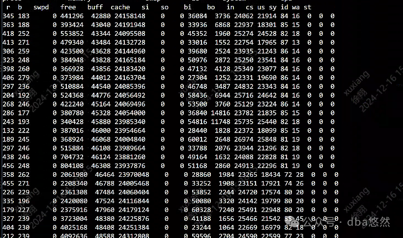 2)vmstat显示runing峰值接近450(cpu16c),而blocking接近300,cpu100%耗尽,cs/in很高: