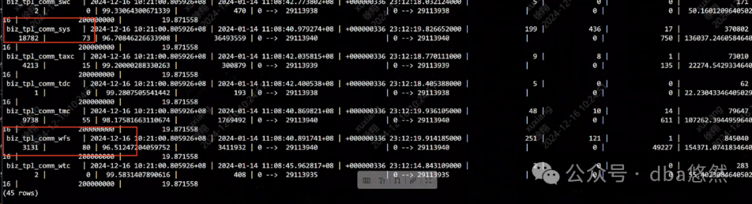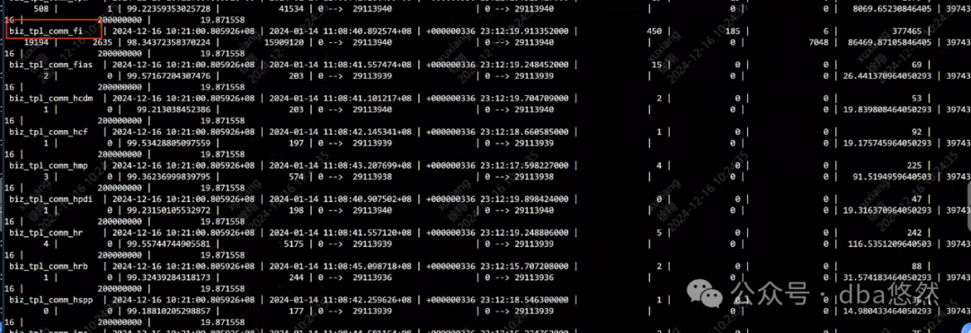 1)数据库负载运行一览:数据库负载主要集中sys/fi/wfs这几个库,平均dml相对比较高,部分db有轻微的tmp生成;数据库缓存命中率略有高地,age年龄正常: