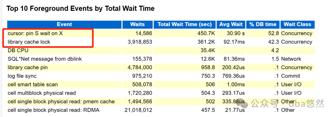 等待事件"Cusors pins s wait on x/librarycache pin",类似如下: