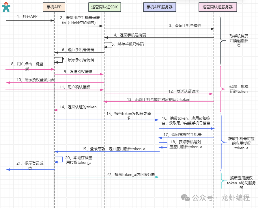 用户点击“本机号码一键登录”按钮之后,APP发送授权请求到运营商服务器上,运营商验证通过之后返回手机号掩码和手机号掩码对应的token给应用APP。