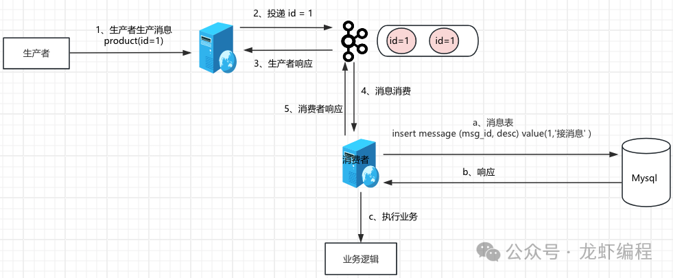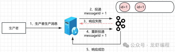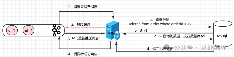 消费者第一次消费id=1的消息时候,此时消费此时消费成功但是响应MQ的时候超时导致MQ认为当前的消息消费者没有成功消费,过一段时间之后重新投递给消费者消费,那么就导致同样的消息消费者消费了两次,此时消费者需要自己做幂等性的处理。