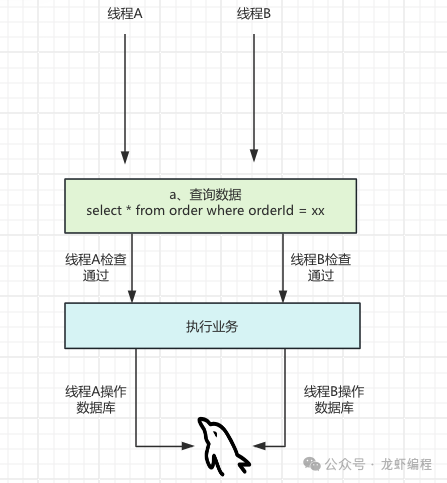 线程A和线程B同时到达查询位置,此时查询的时候没有数据,此时线程A继续持有时间片,线程B时间片用完,那么线程A执行业务并操作数据库,同时线程B又获得时间片开始执行业务处理。最终的结果就是线程A和线程B执行了两次数据库操作。所以高并发下查询法没有办法完成消息幂等性问题。