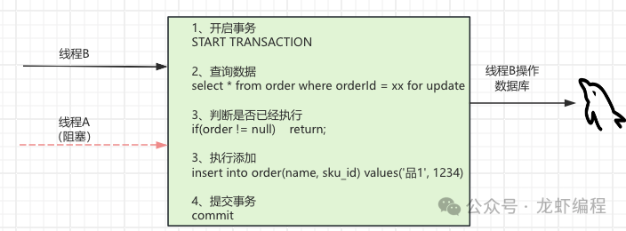 查询法中在高并发下仍然存在消息幂等性的问题,那么针对查询法的缺陷可以使用在底层加悲观锁的方案来解决,即就是查询的时候添加for update,这样可以保证在一个线程事务中加锁成功后,其他的线程就必须等待释放锁才能操作,如下图所示: