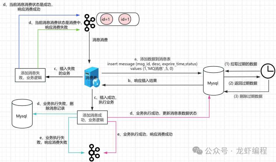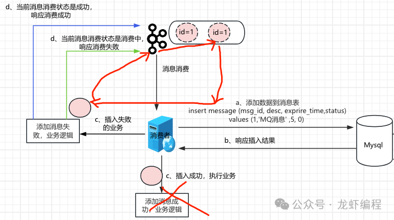 (b)MQ消息添加数据库失败;查询已经添加到数据库中的MQ消息的的数据(如数据库中的数据:msgId=1, desc='MQ消息', expireTime=5 , status=0),根据数据status的值做判断:如果status=0(表示消息正在消费中)此时就要返回给MQ消息消费失败,等待下一次继续推送;如果status=1(表示消息消费成功),此时给MQ返回消息消费成功。