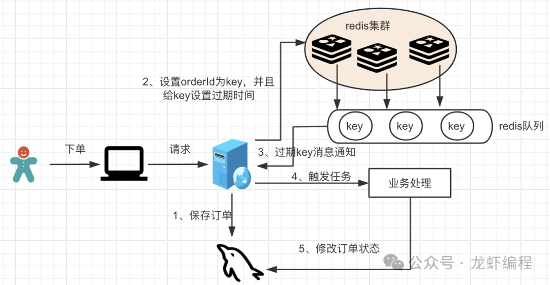 通过redis的的过期通知机制实现延迟功能,将订单的id做key设置过期时间,然后在到达过期时间后,redis会发送一个通知会给服务器,服务器会触发相关的业务处理。
